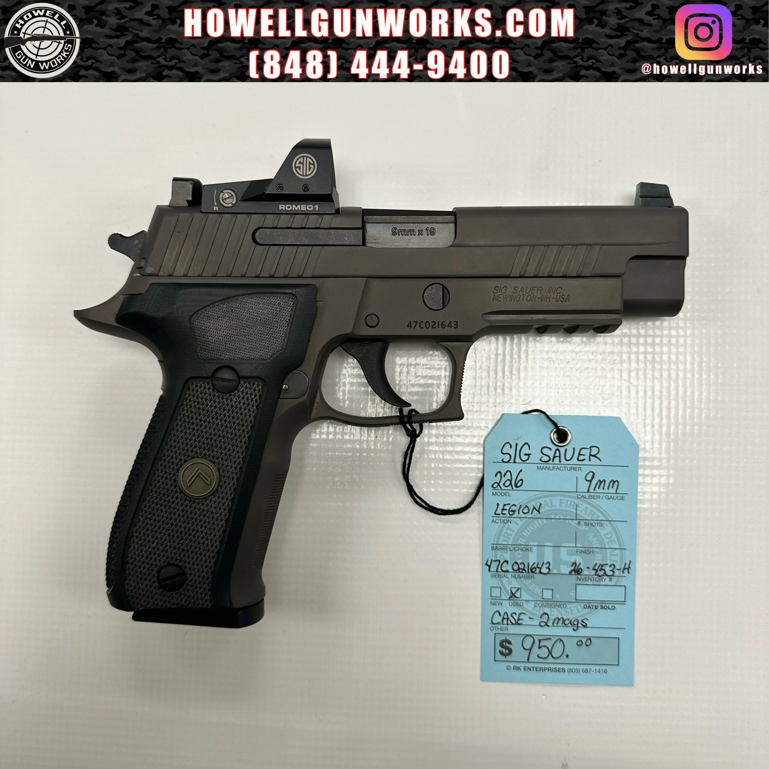 Image 1 of 3 Image 2 of 3 Image 3 of 3 SIG Sauer P226 Legion 9mm $950.00 Used. Has a case and 2 mags. 26-453-H Add To Cart Added! Used. Has a case and 2 mags. 26-453-H