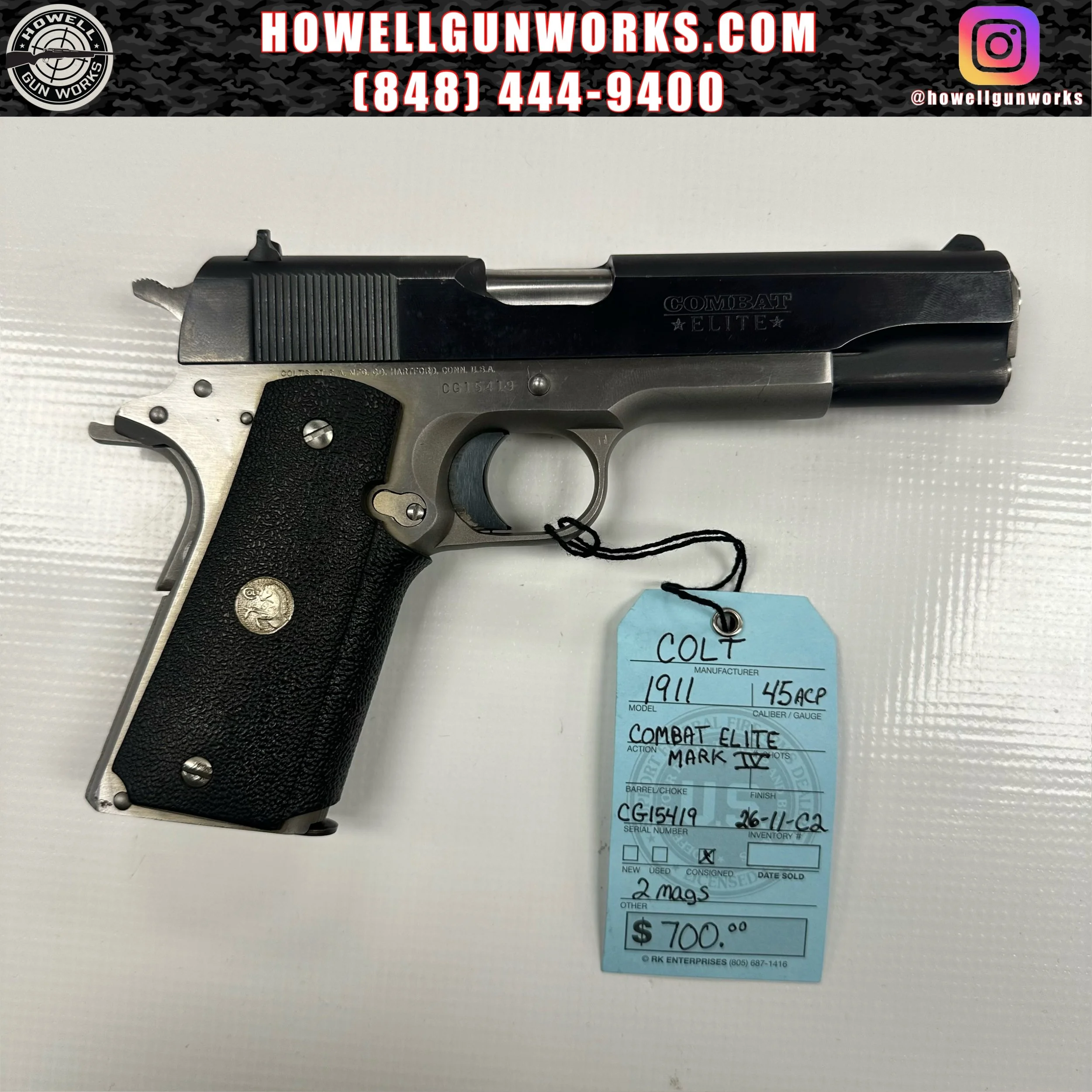 Image 1 of 3 Image 2 of 3 Image 3 of 3 Colt 1911 Combat Elite Mark IV .45ACP $700.00 Used. Has 2 mags. Add To Cart Added! Used. Has 2 mags.